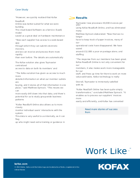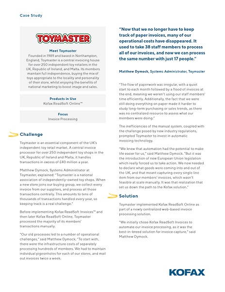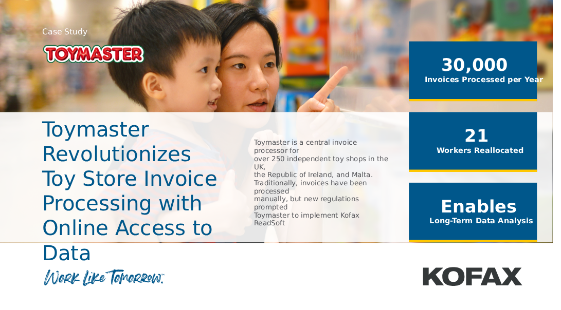 Download the Cloud Invoice Processing Case Study to discover more details on how Toymaster benefitted from the Kofax Readsoft Invoice Platform.